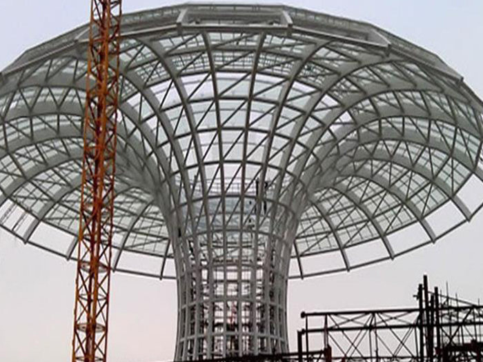 二、球形网架结构因其结构新颖,受力合理,自重轻、用钢量低等优点。如大型体育场馆球形长宁螺栓球网架、公共场馆球形网架、电厂长宁螺栓球网架、水泥工业球形网架、仓储物流球形网架、长宁干煤棚工业球形网架、长宁收费站长宁加油站球形网架、展览中心、影剧院、商场、航站楼、候车厅、工厂长宁车间、仓库、电视塔等球形螺栓球节点网架。国内球形网架结构主要分为:长宁焊接球节点网架及螺栓球节点网架两种。螺栓球节点网架其构件工厂内加工量较大,现场安装便捷,适用于现场工期紧,长宁施工条件、用电量受制约,网架形状复杂、长宁杆件定位困难的异形结构。螺栓球节点球形网架系统基本由长宁杆件、螺栓球、支撑支座等组成。按照节点形式可分为交叉长宁桁架体系、四角锥体系、三角锥体系等。支撑方式多为固定支座支撑。对于大面积、大跨度及有特殊受力或伸缩要求的网架结构可采用橡胶支座、滑移支座、球铰支座等支撑形式,以满足结构自身的受力稳定、均衡,便于内力释放等设计要求。